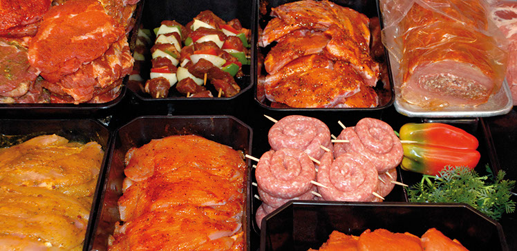 Rouladen, Schaschlik, Rindergulasch, Putengeschnetzeltes, Hackbällchen und