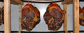 Neben unserem ausgezeichneten Kochschinken ist besonders der handgesalzene Knochenschinken zu nennen. Nachdem dieser über Buchenholz leicht kalt geräuchert wird, hängt er für 7 bis 9 Monaten im Reiferaum unter optimalen Temperaturen und Luftfeuchtigkeitsbedingungen, hierdurch verliert der Knochenschinken ca. die Hälfte seines Gewichtes. Die charakteristischen Folgen sind das dunkelrote Fleisch und die goldgelbe Schwarte eines Schinkens mit besonders mildem und leicht nussigem Geschmack. Diese traditionelle Herstellungskunst wurde von Generation zu Generation weitergegeben und ist Ausdruck für die Bewahrung regionaler, ursprünglicher und natürlicher Produkte.